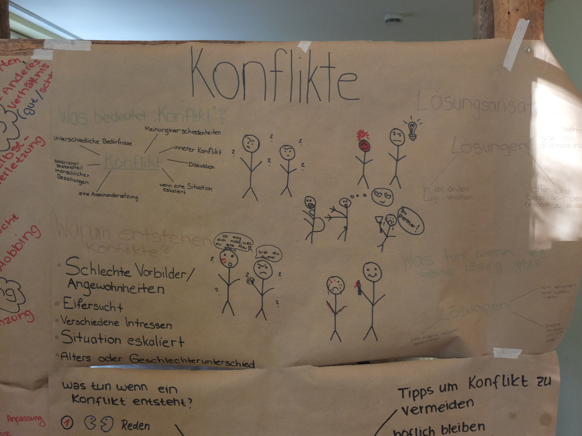 Inhaltlich ging es um Konfliktsituationen, Ursachen, Verhalten und Reaktionsweisen, aber auch um Körpersprache und deren Deutung, sowie um den Aufbau und Ablauf des Streitschlichtungsgesprächs nach dem ‘Bensberger Modell‘ und Gesprächsstrategien im Allgemeinen.