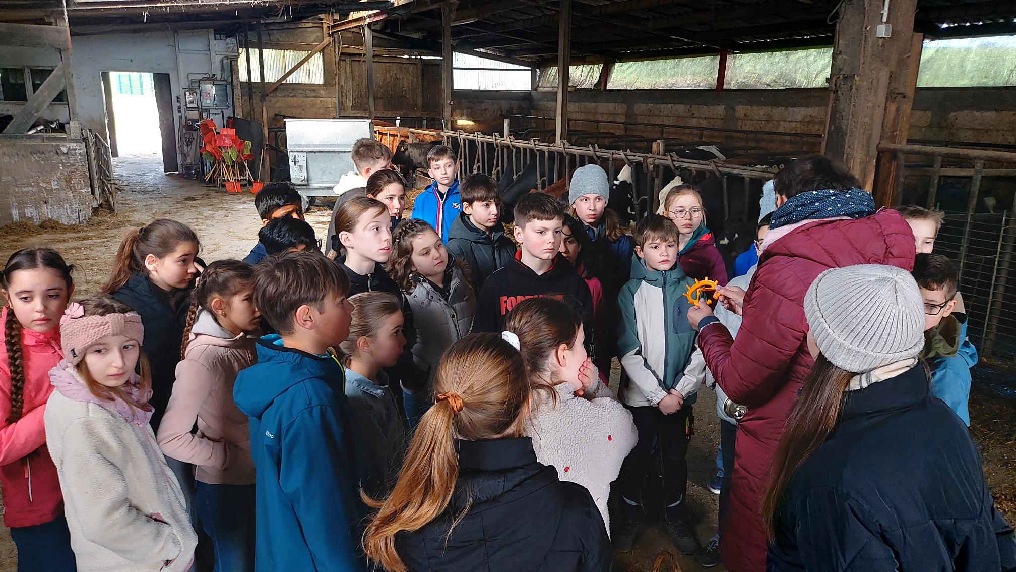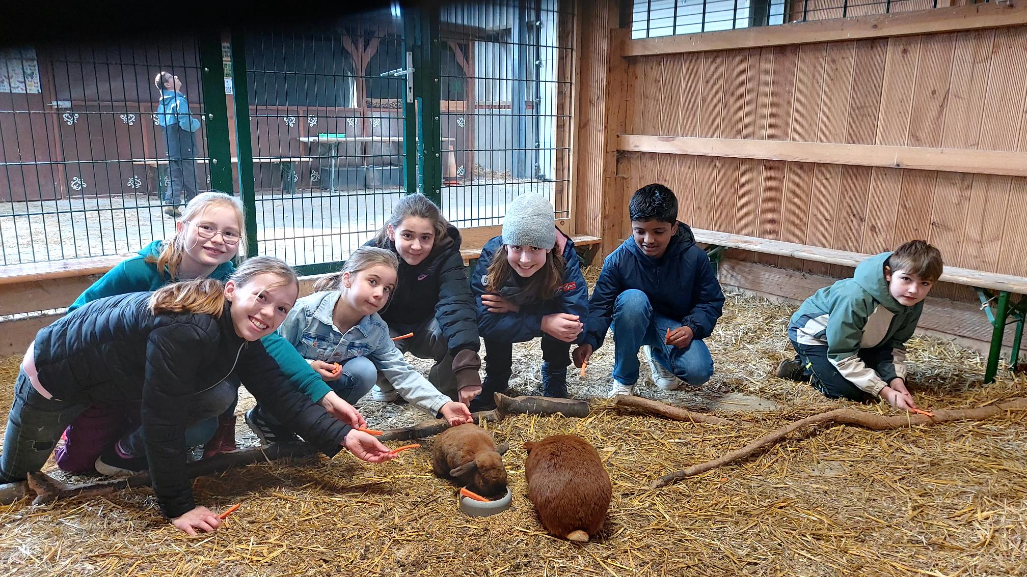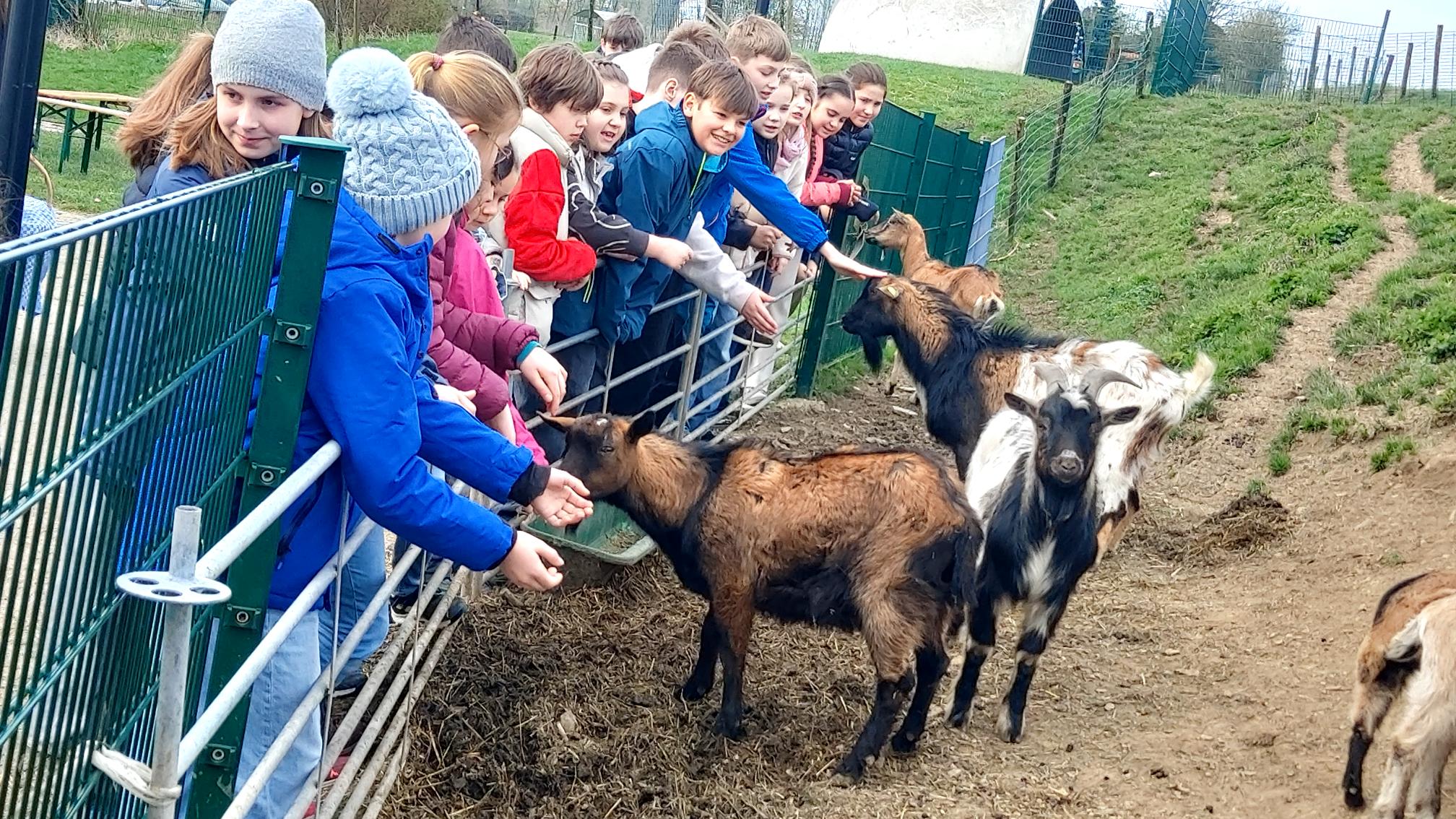 Auf dem Gut Hixholz gab es für die 5. Klasse viel zu entdecken und zu tun: Kühe mussten gefüttert und gestreichelt werden. Dazu gab es viel zu lernen: Was muss passieren, damit eine Kuh Milch gibt? Warum ist nur ein einziger Bulle im Stall? Wie werden Rinder gehalten? Später wurden auch die Lämmchen und Kälber mit einem „Oh wie süß“ bedacht, federleichte Hühner auf den Arm und sich vor Schweinezähnen in Acht genommen. Wenn nur die Kaninchen nicht so satt gewesen wären!