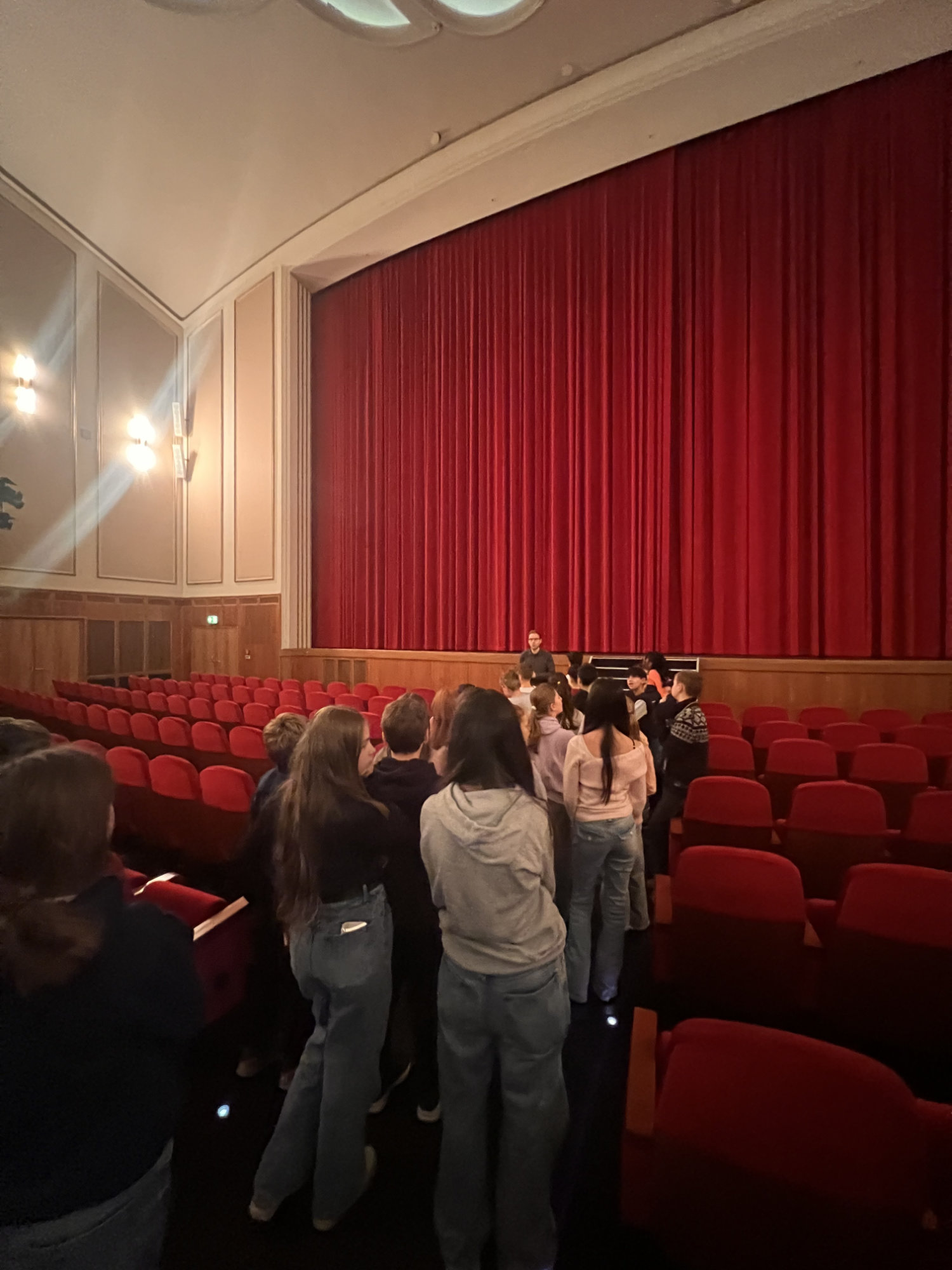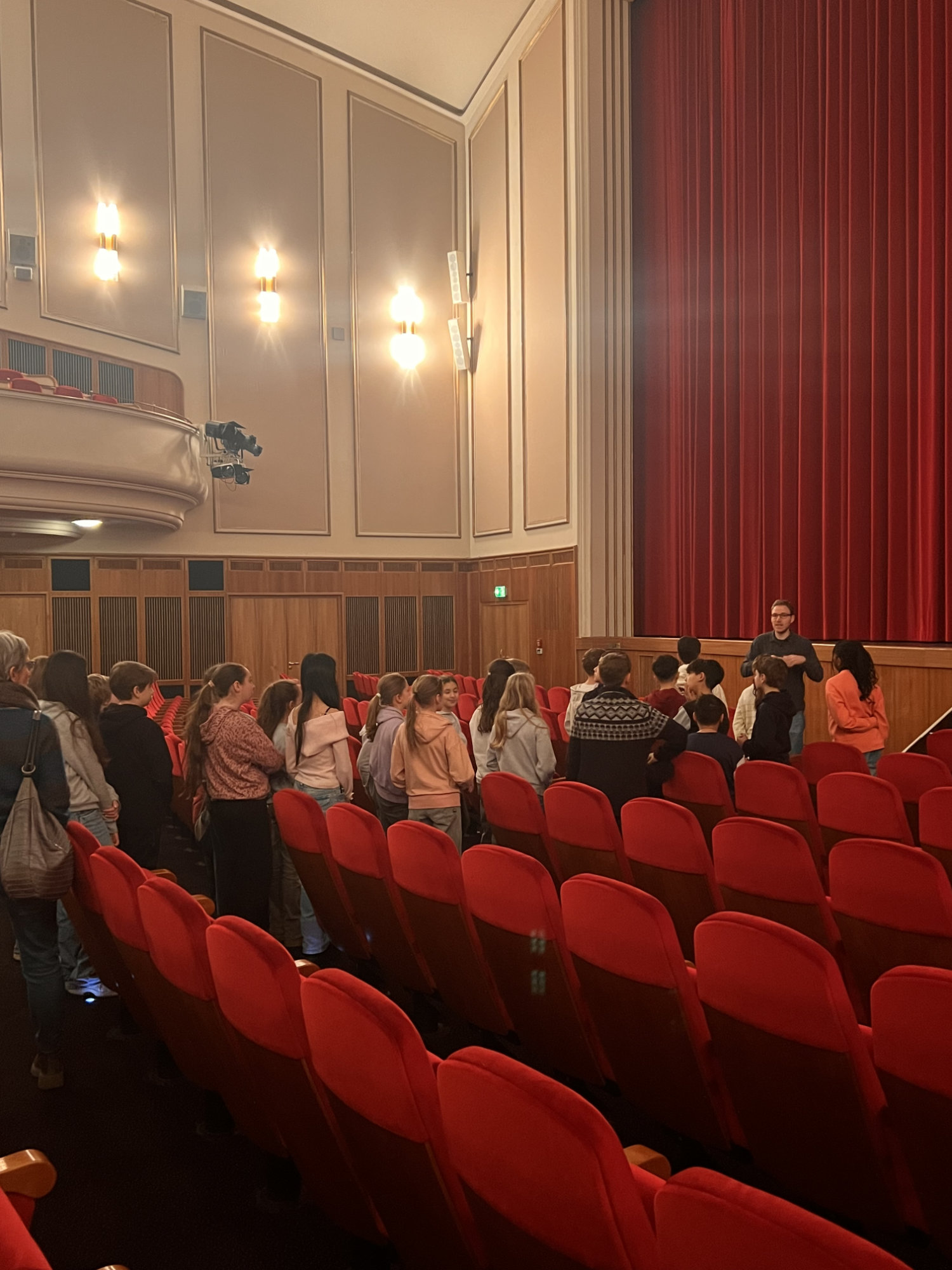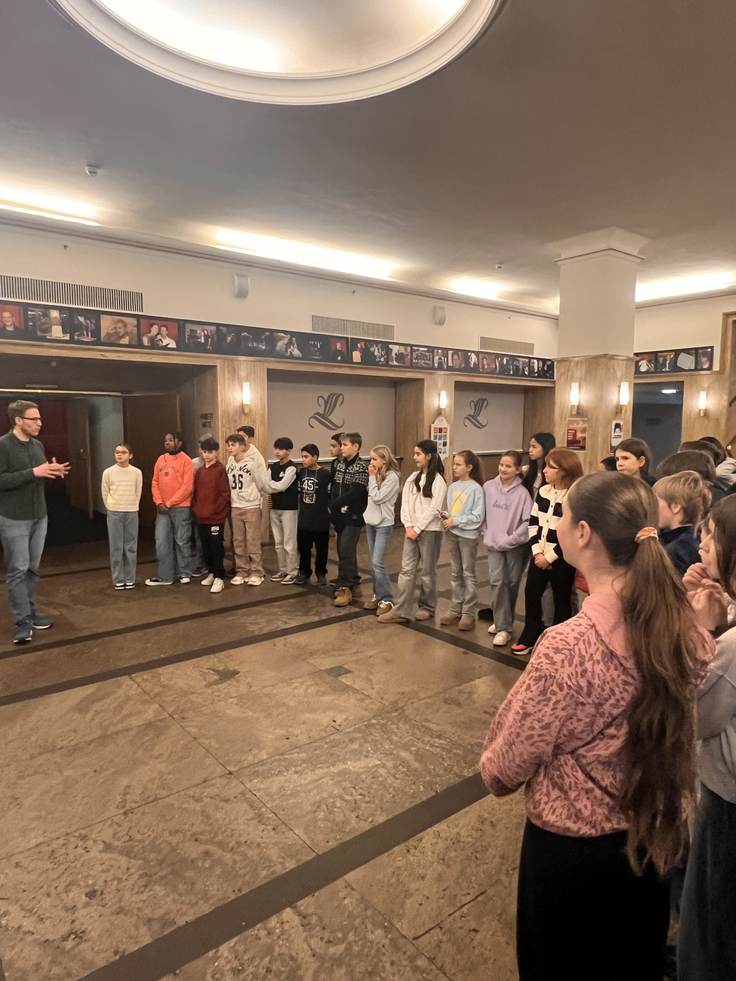 Im Dezember machten sich die Klassen 5b und 6b gemeinsam auf den Weg zur Lichtburg in Essen – dem ältesten und größten Kino Deutschlands. Dort erwartete uns zunächst eine spannende, fast einstündige Führung durch das traditionsreiche Kino. Wir erfuhren viele interessante Fakten über die Geschichte der Lichtburg, die beeindruckende Technik hinter der großen Leinwand und die zahlreichen Premierenveranstaltungen, die hier regelmäßig stattfinden.