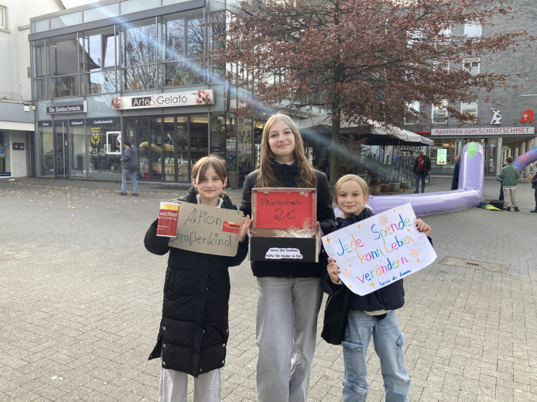 Letzten Donnerstag beteiligten sich Schülerinnen und Schülern der drei sechsten Klassen an der Aktion Sichtwechsel und sammelten Spenden für Straßenkinder weltweit in der Velberter Innenstadt. Sie hatten sich auf diesen Vormittag vorbereitet und verkauften selbstgebackene Kuchen und Muffins, boten Gebasteltes an, spielten Instrumente, wie z.B. Saxofon und Trompete, turnten, fuhren Einrad und vieles mehr.