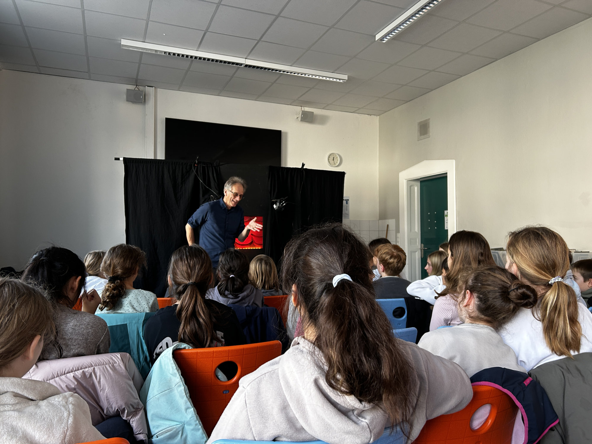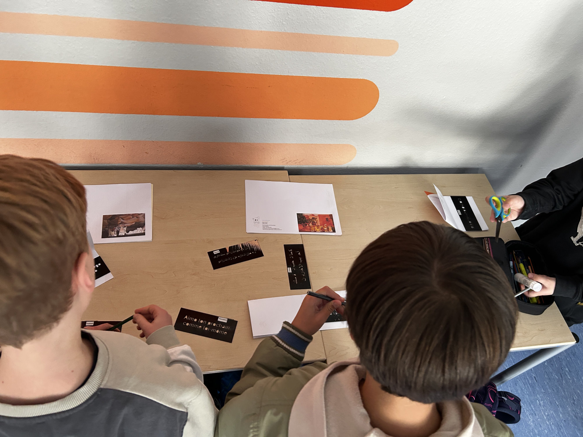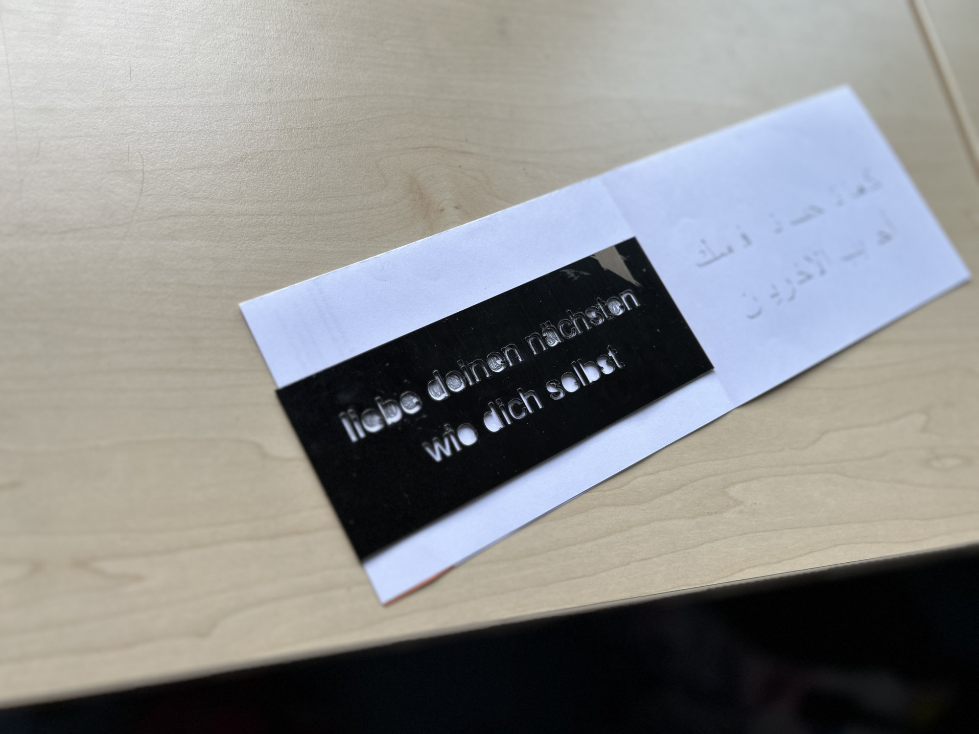 Mit seiner Darstellung der Erzählung vom Barmherzigen Samariter rührte er alle zu Herzen und appellierte, Vorurteile abzubauen und das Herz für Mitmenschen zu öffnen. Die Schülerinnen und Schüler konnten mithilfe von Schablonen „Liebe deinen Nächsten wie dich selbst“ in vielen verschiedenen Sprachen auf Postkarten schreiben und als Andenken mitnehmen.