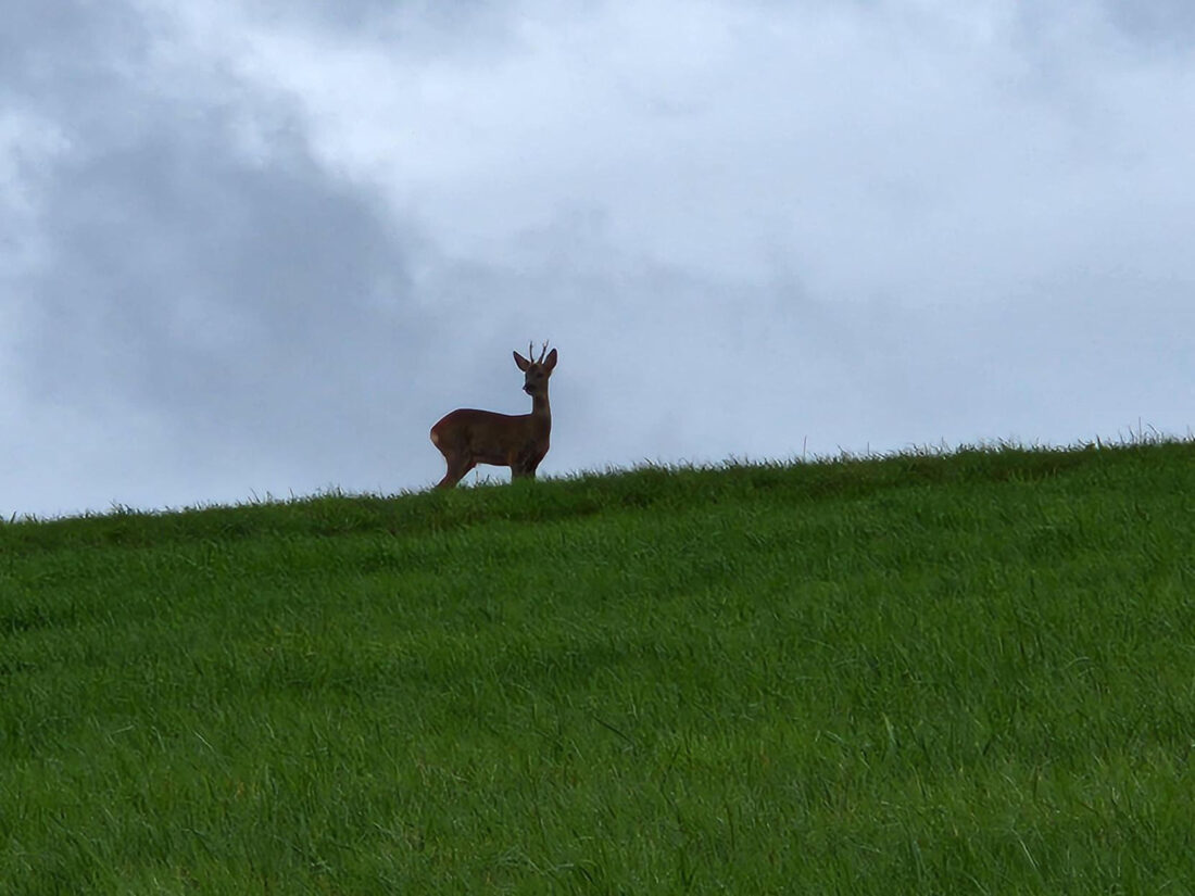 Besonders erfolgreich war Charlotte Marechal aus dem Grundkurs Katholische Religionslehre der EF: Mit ihrem Foto schaffte sie es unter die zehn bestprämierten Beiträge. Das Bild zeigt ein Reh, das aufrecht und gut sichtbar auf einer grünen Wiese steht, während sich im Hintergrund graue Wolken auftürmen. „Das Bild steht für Hoffnung, weil das Reh so gerade steht, obwohl es allein und schutzlos ist. Die grüne Wiese symbolisiert Hoffnung und gute Zeiten im Kontrast zu den grauen Wolken“, erläutert Charlotte ihre Bildidee.